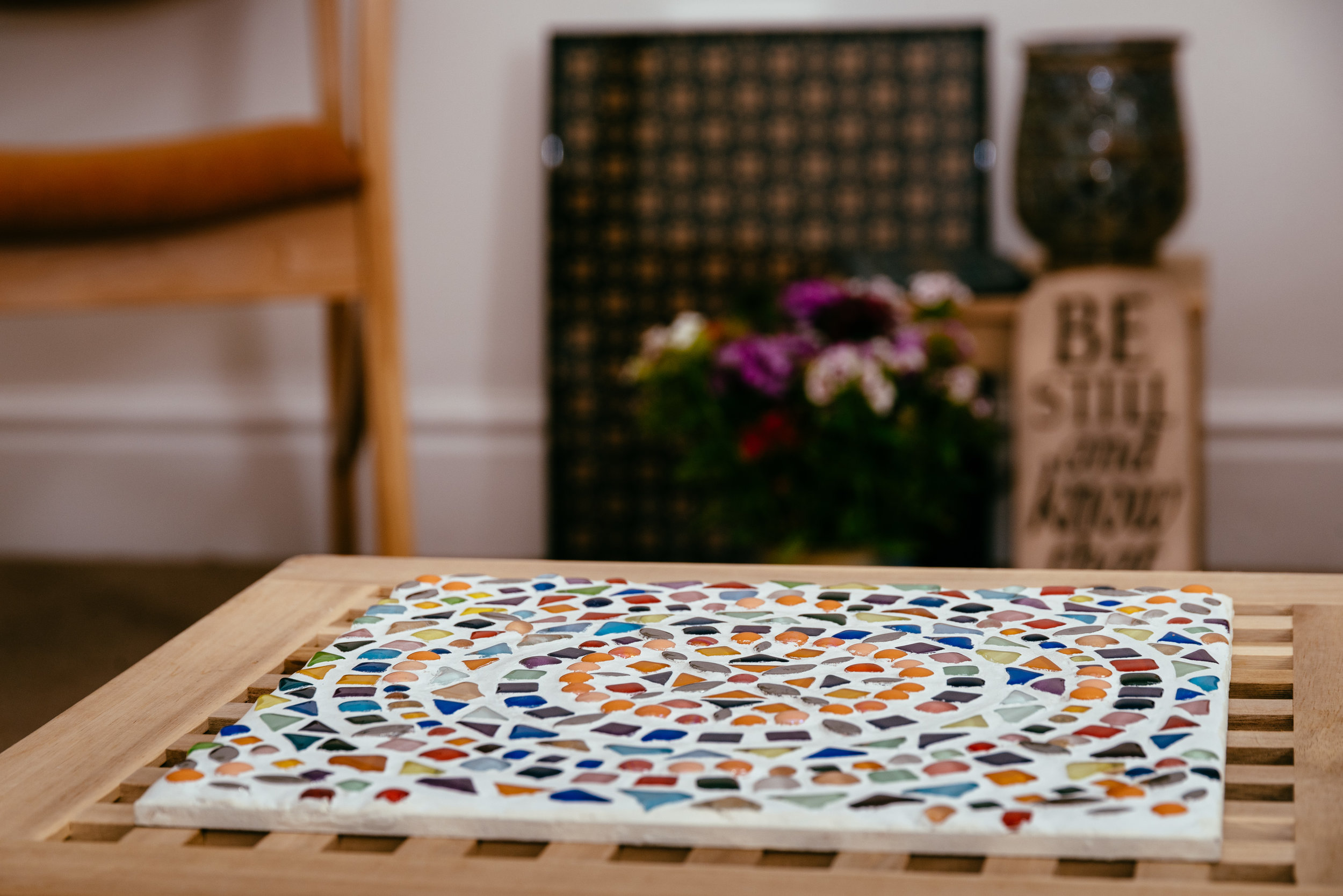 Our mosaic was made by a number of people attending a number of Retreat House events. With our ‘logo’ in the centre, its variety of small tiles represents the diversity making up the whole, and its concentric circles shows the ripple effect of retreat throughout our living.